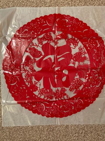 42" x 36" with heart stitching on ribbon trim made and donated by artist Tiarah